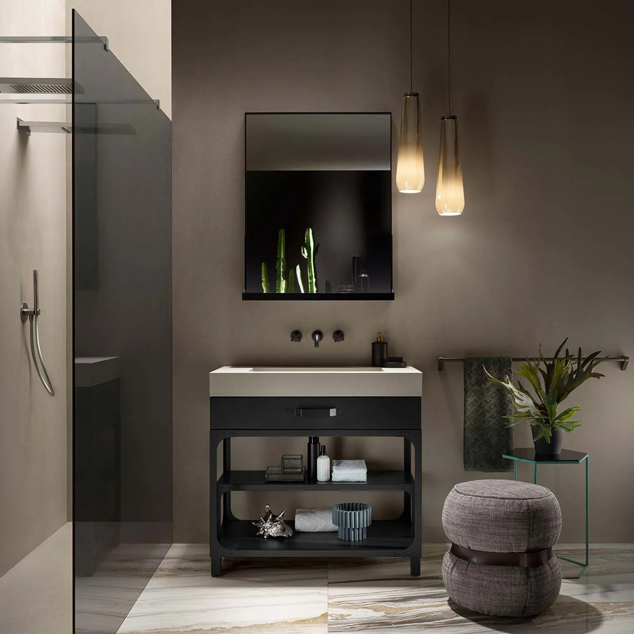 The Misfit Cart unit is in Grey Soft matt painted metal with Mineralmarmo worktop. The composition is completed by the Plug Sink Mineralmarmo sit-on washbasin and the Bronze-finish Lunar mirror. On the right, bathroom cabinet with Titanium finish frame and Bronze glass doors.